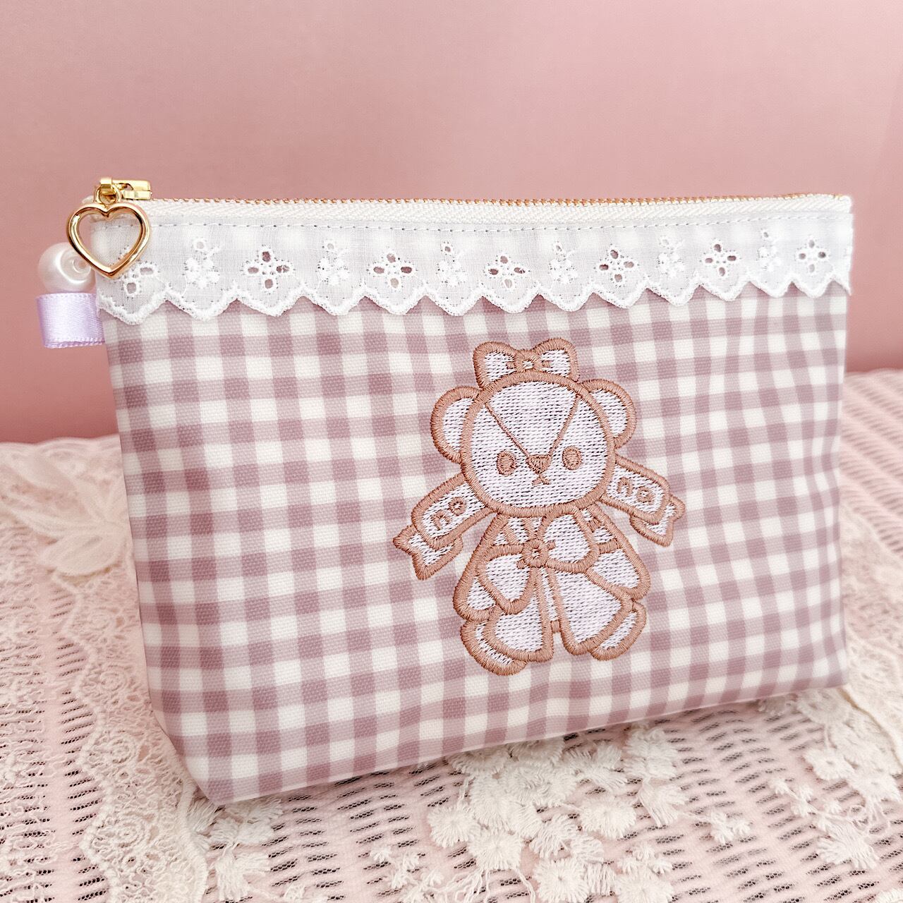 ラベンダーギンガムのラミネート生地の前面にリボンベアの刺繍を施したラブリーなポーチ