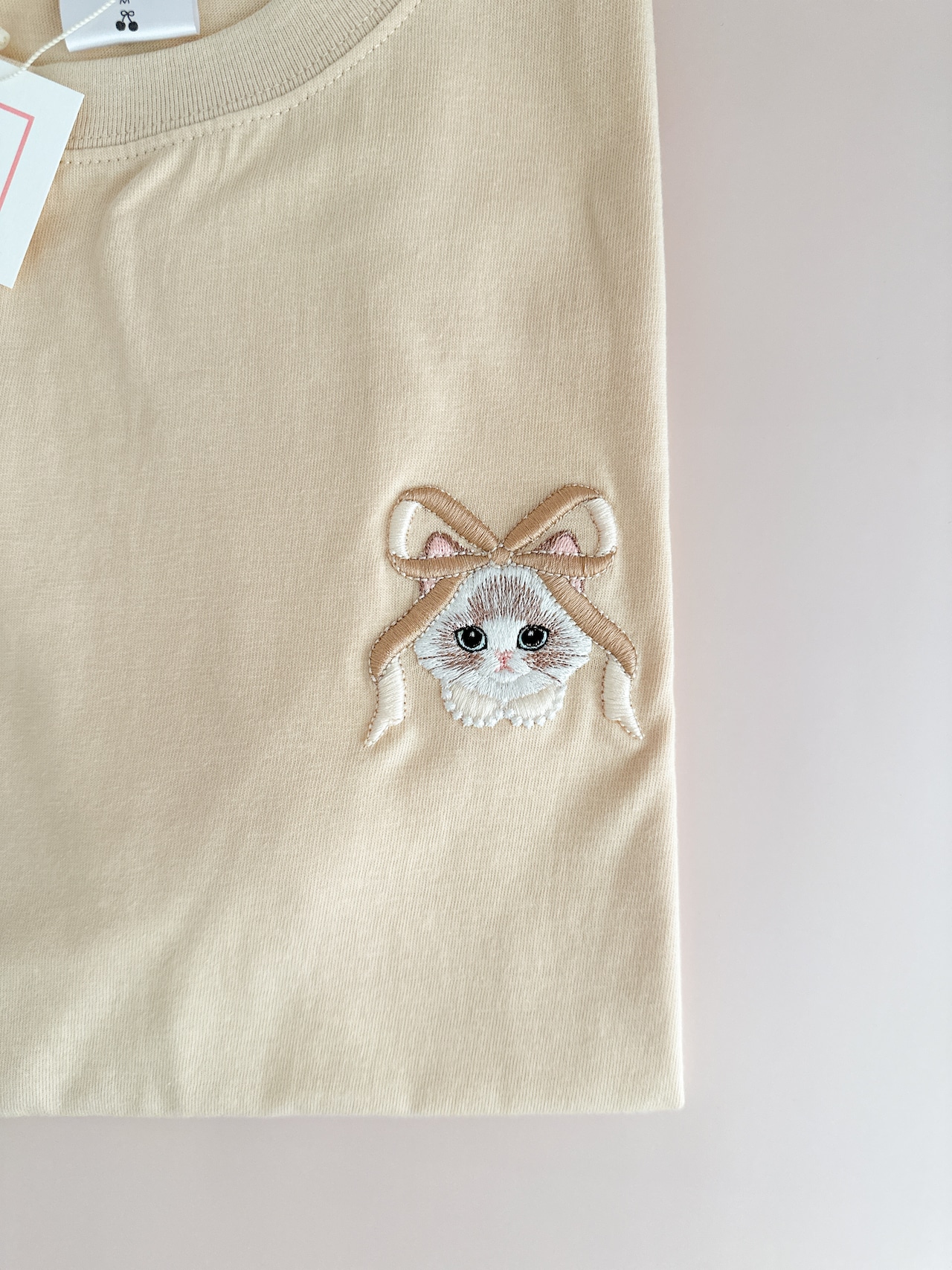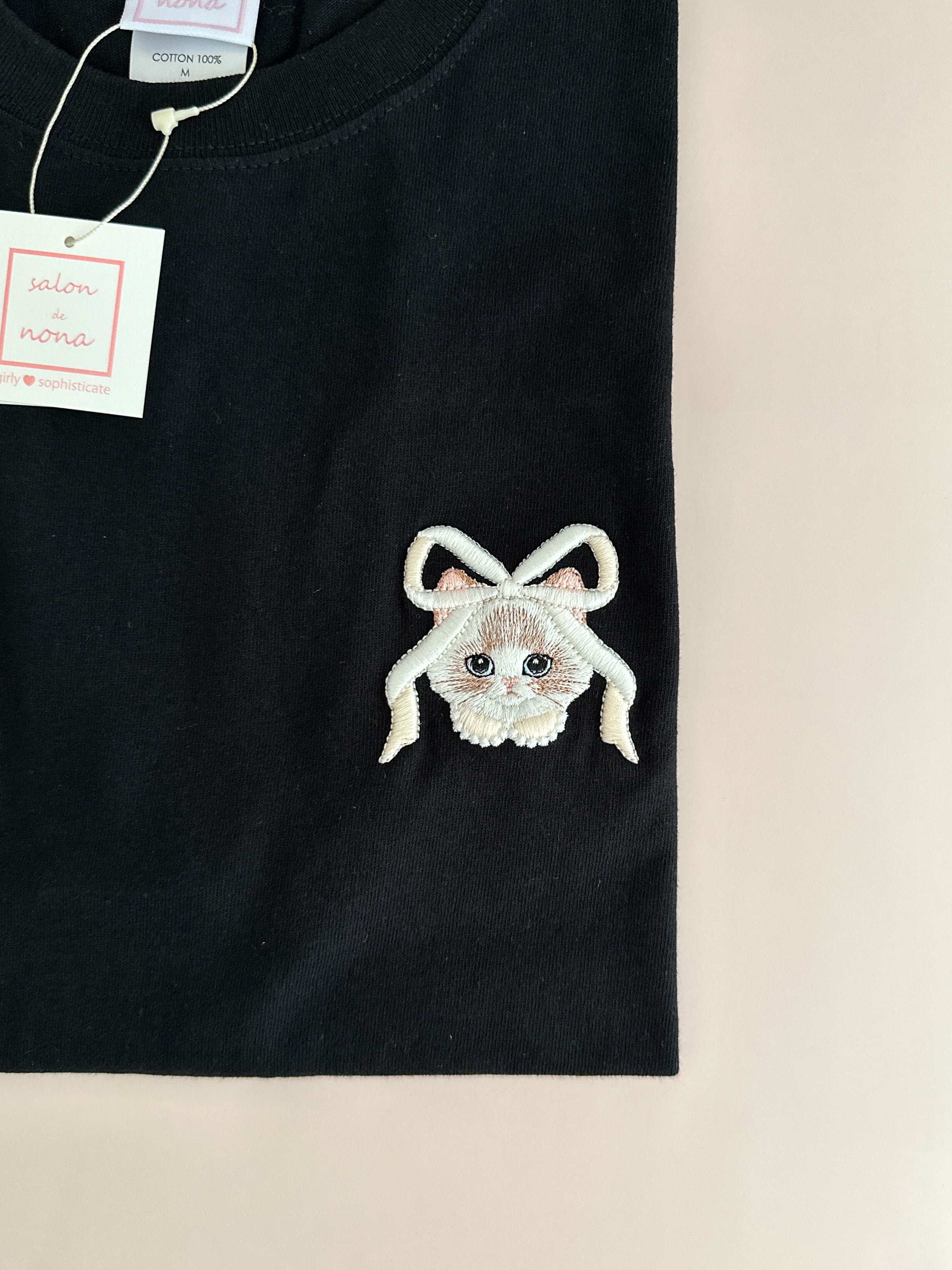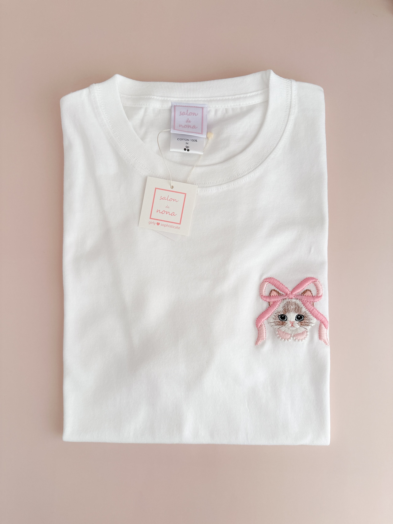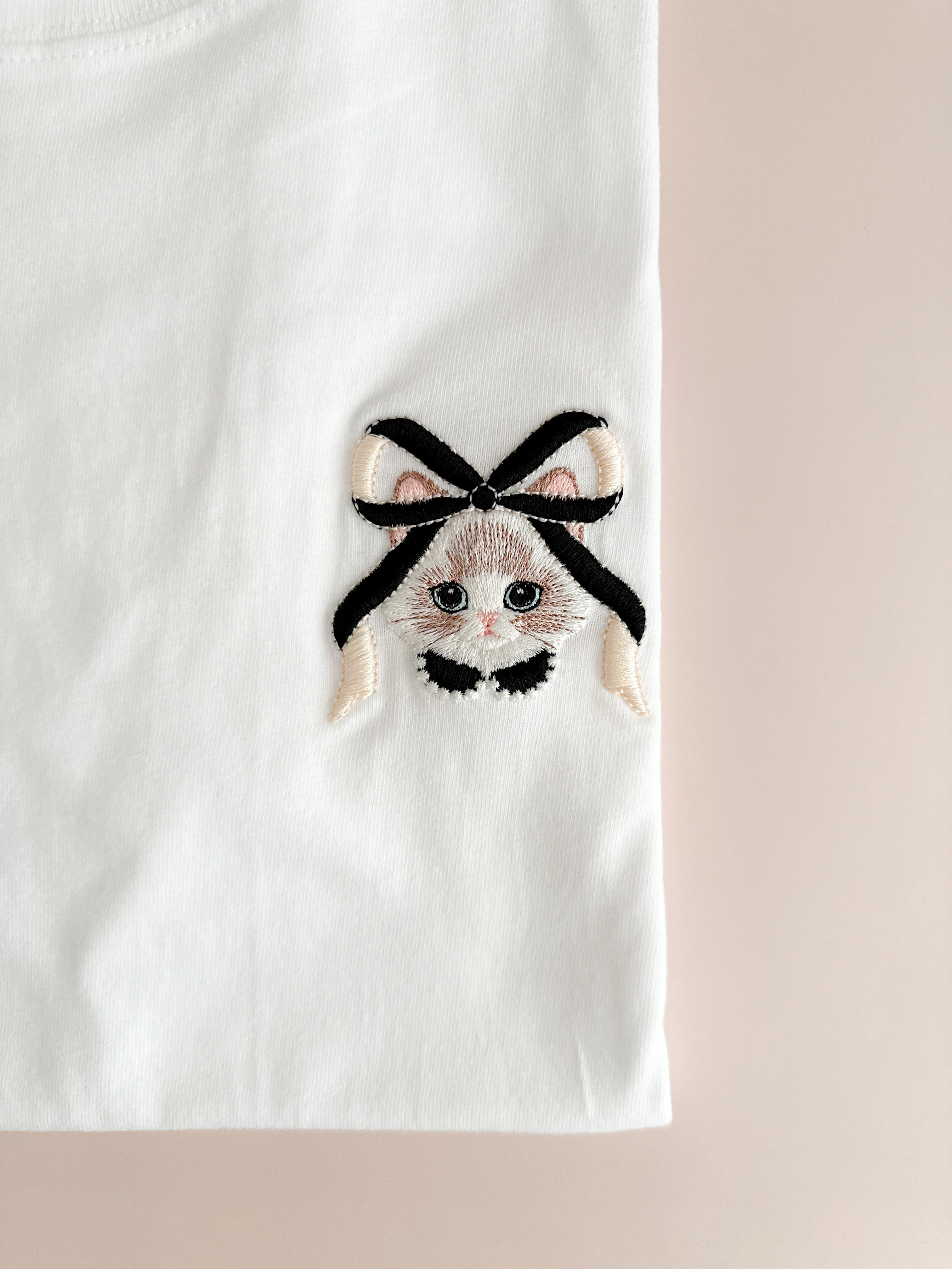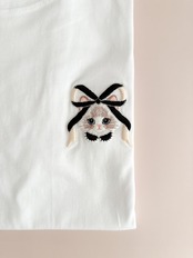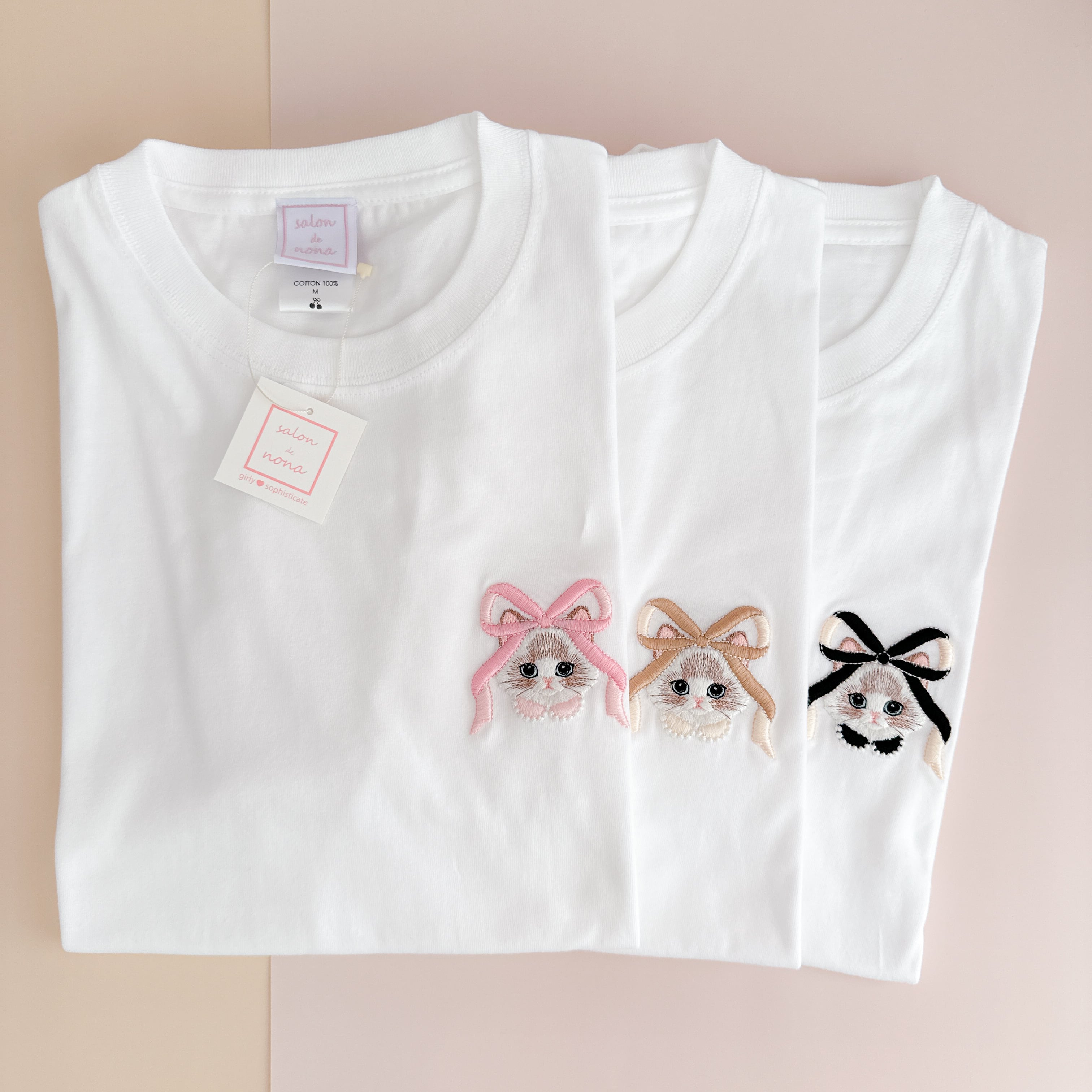 きゅるんとした表情と大きなリボンがキュートなラグドール刺繍を施したTシャツ