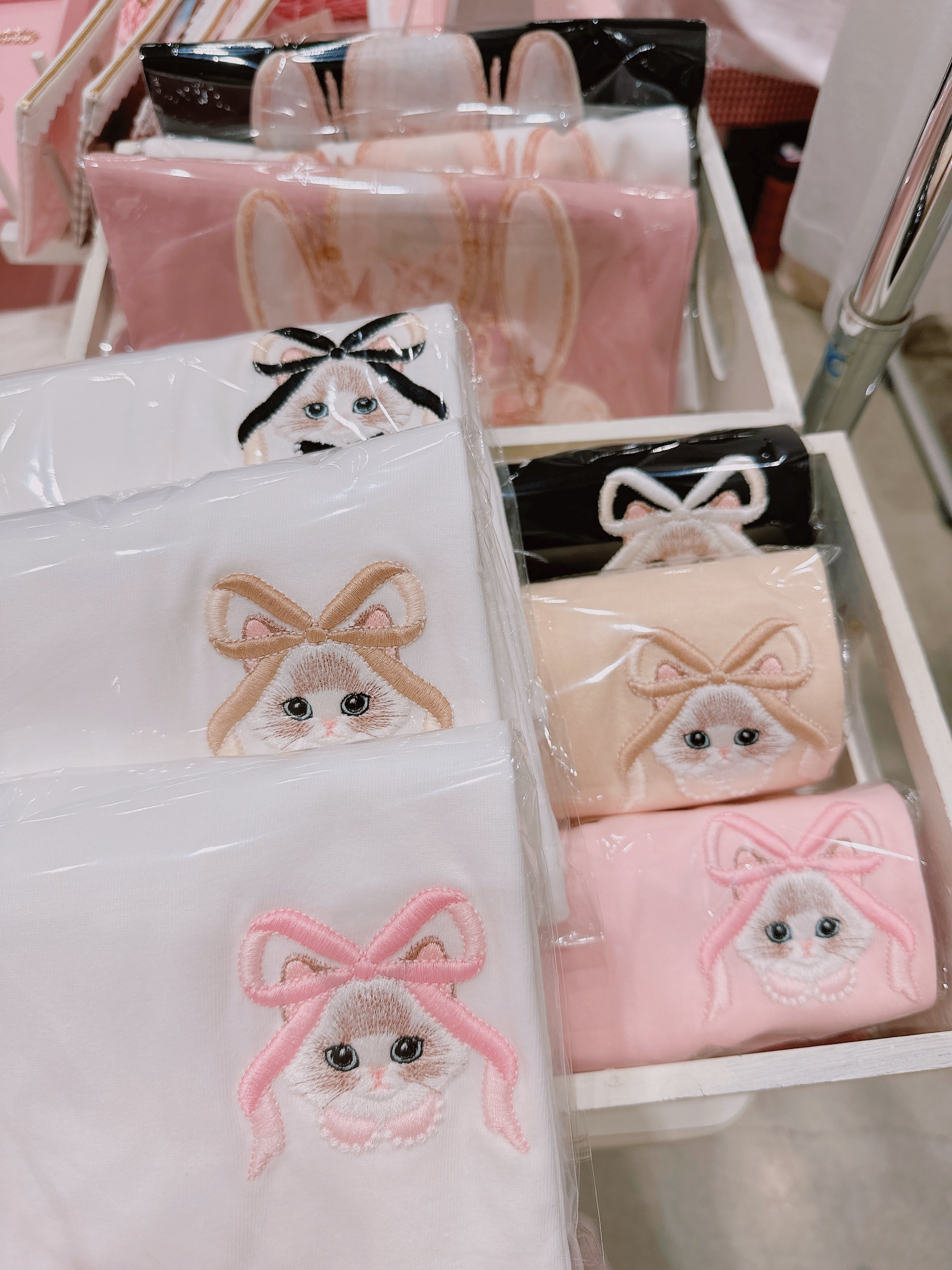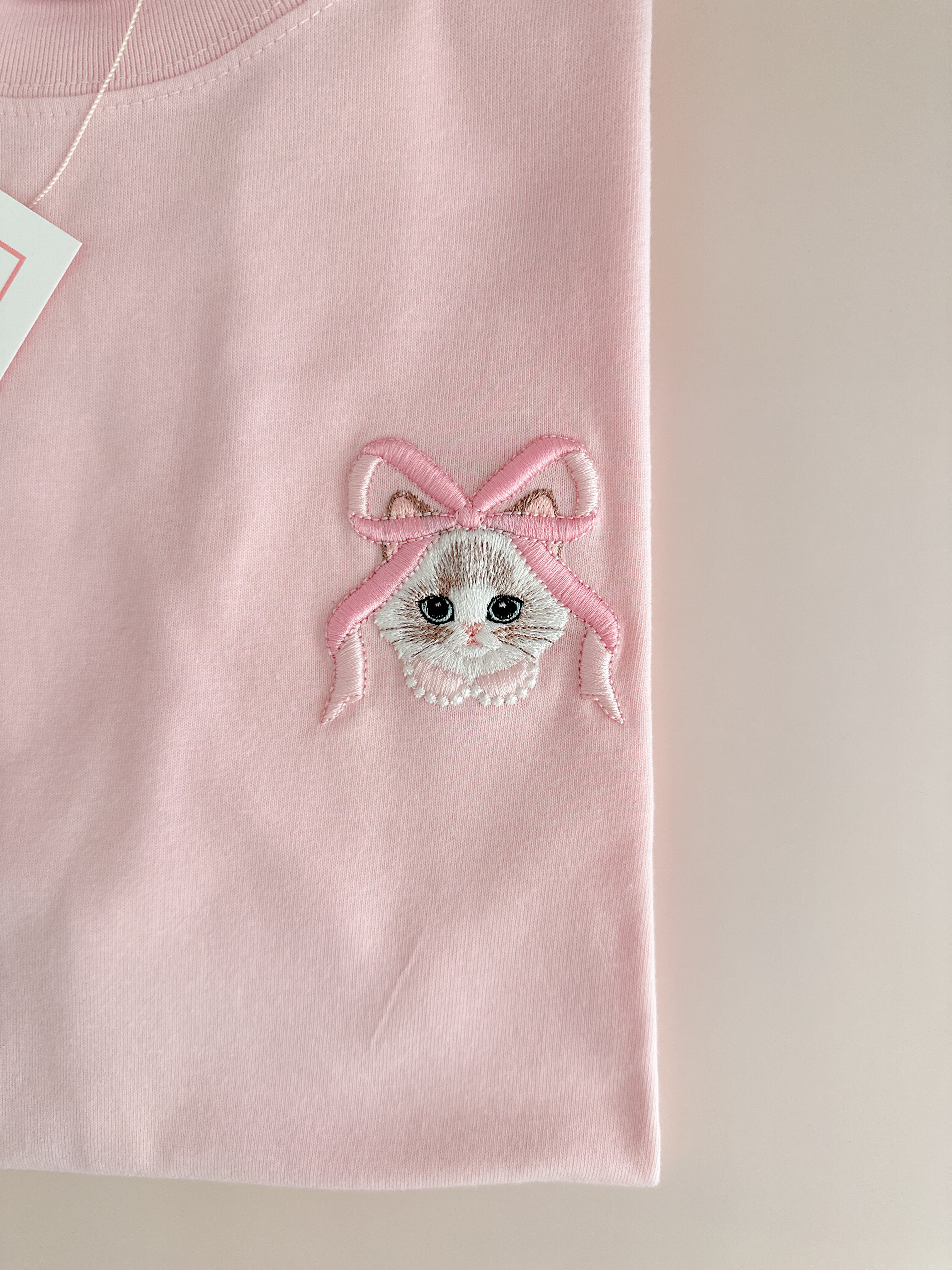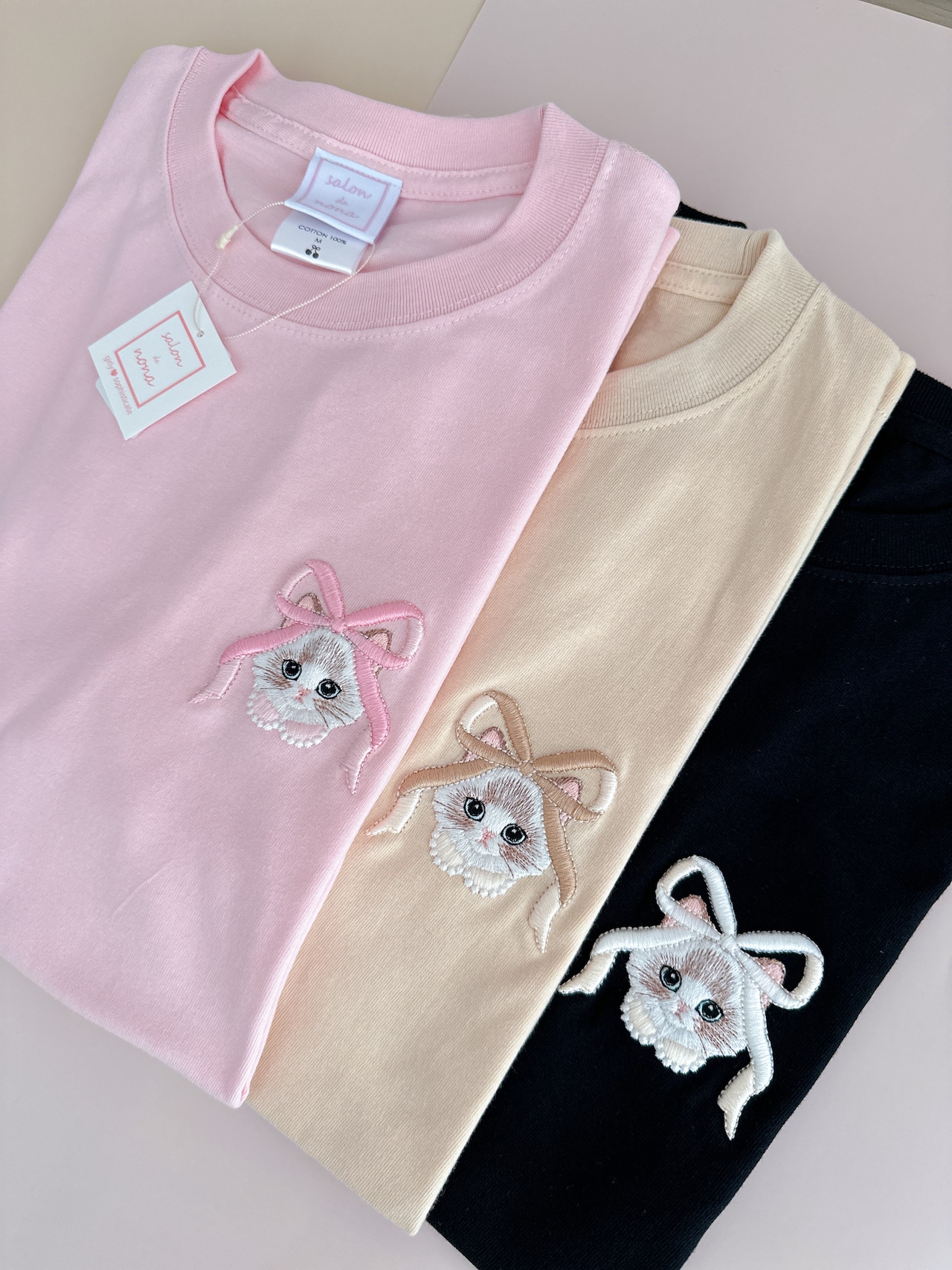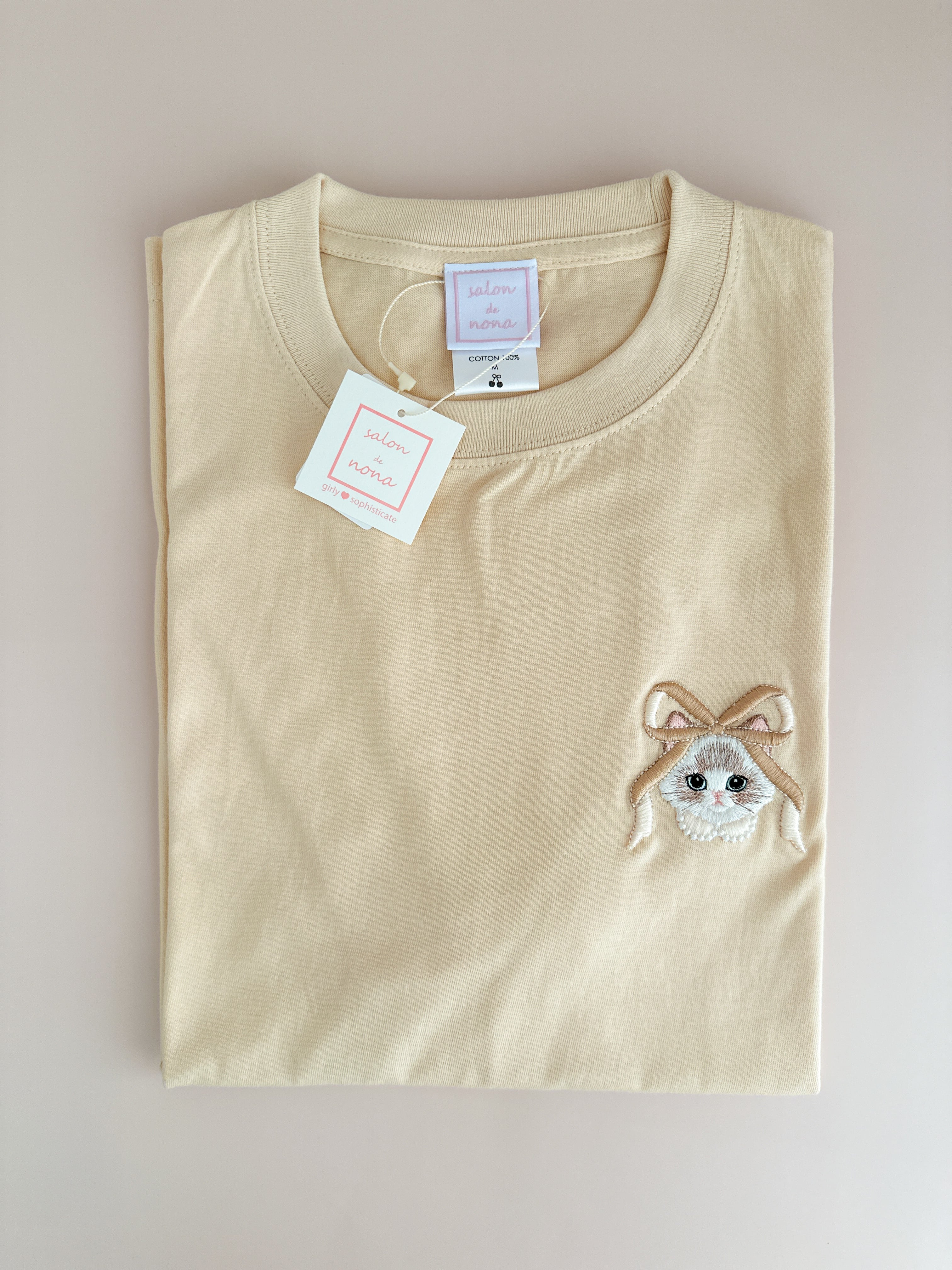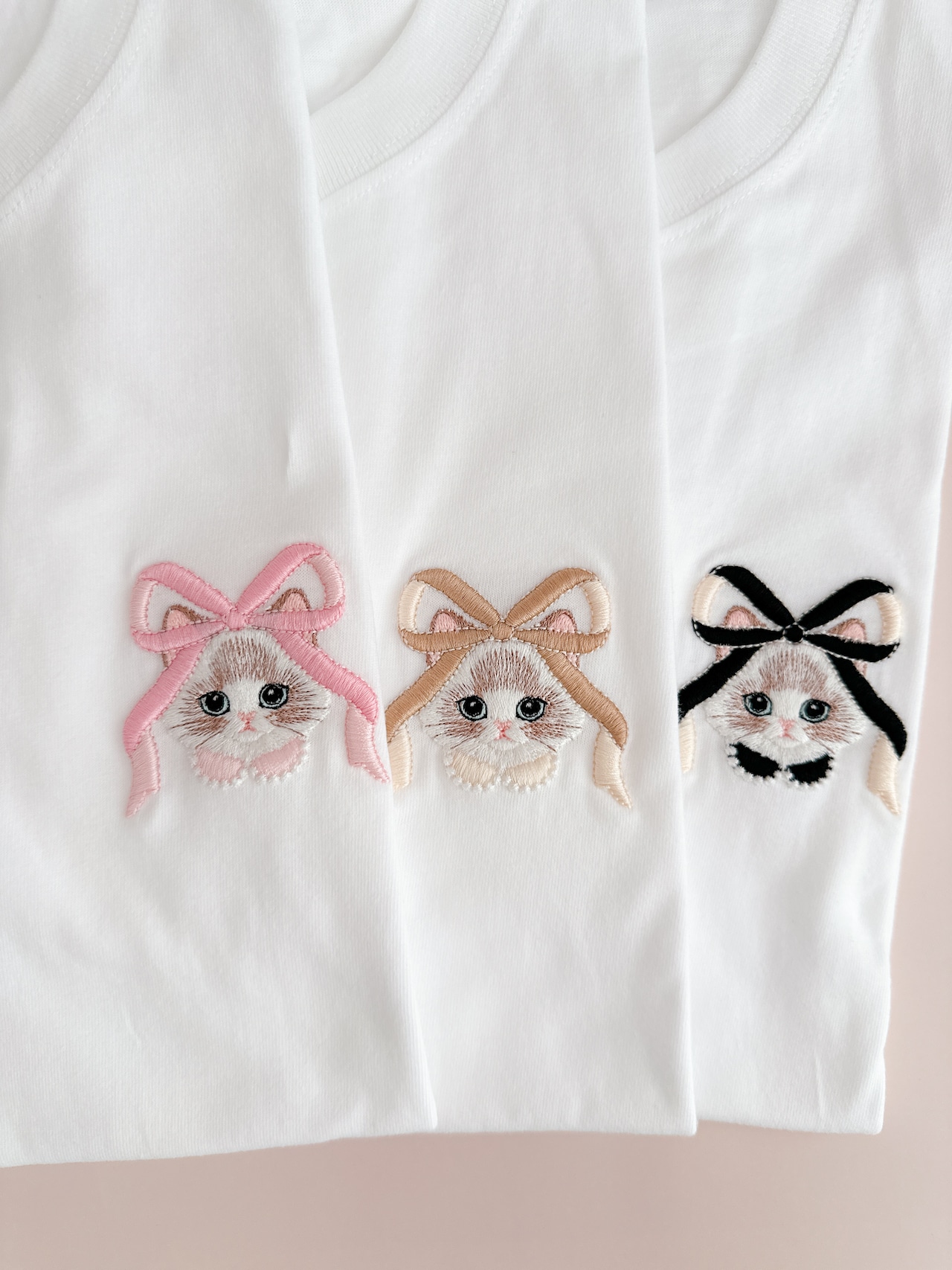 きゅるんとした表情と大きなリボンがキュートなラグドール刺繍を施したTシャツ