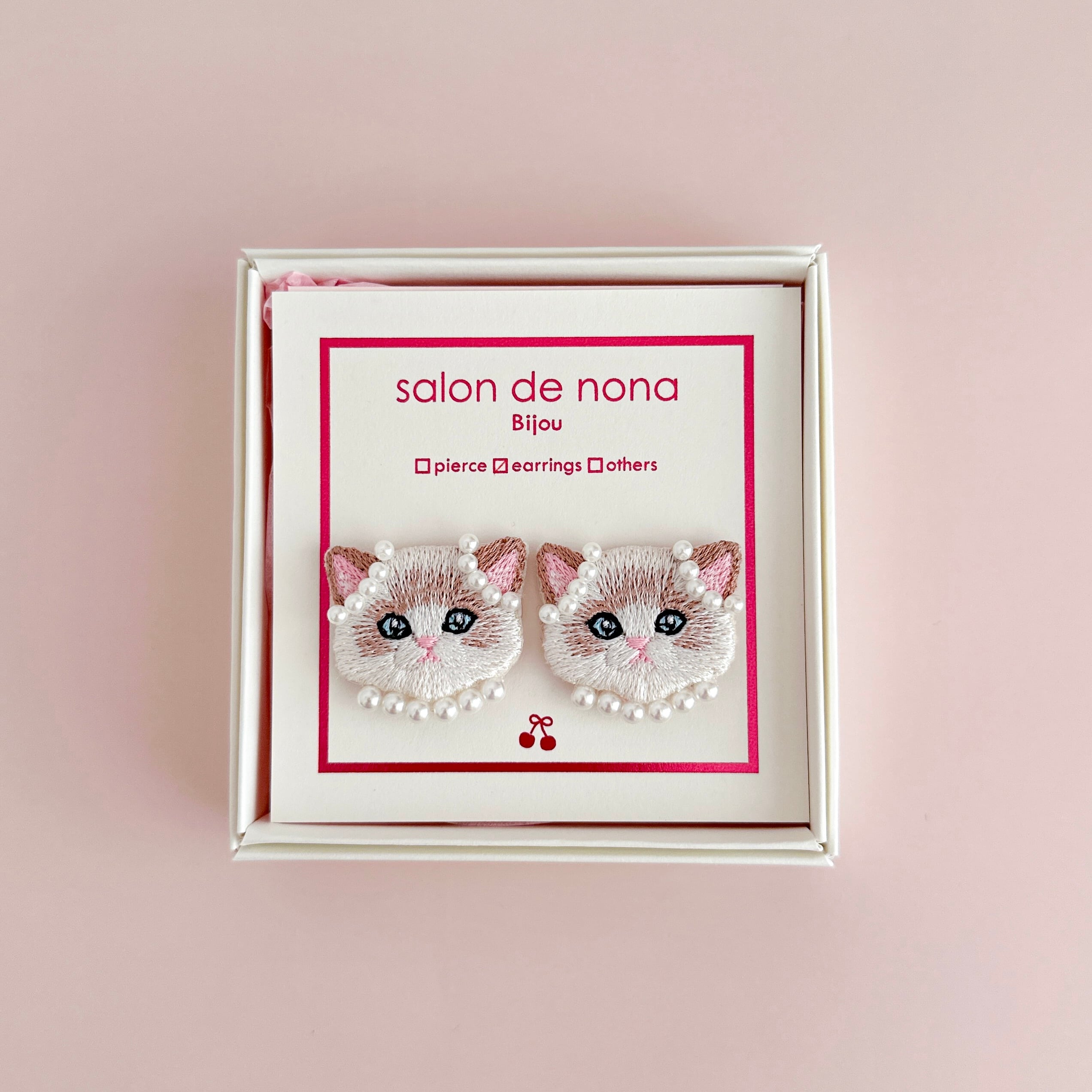 両耳にパールを付けておめかしした猫モチーフです。