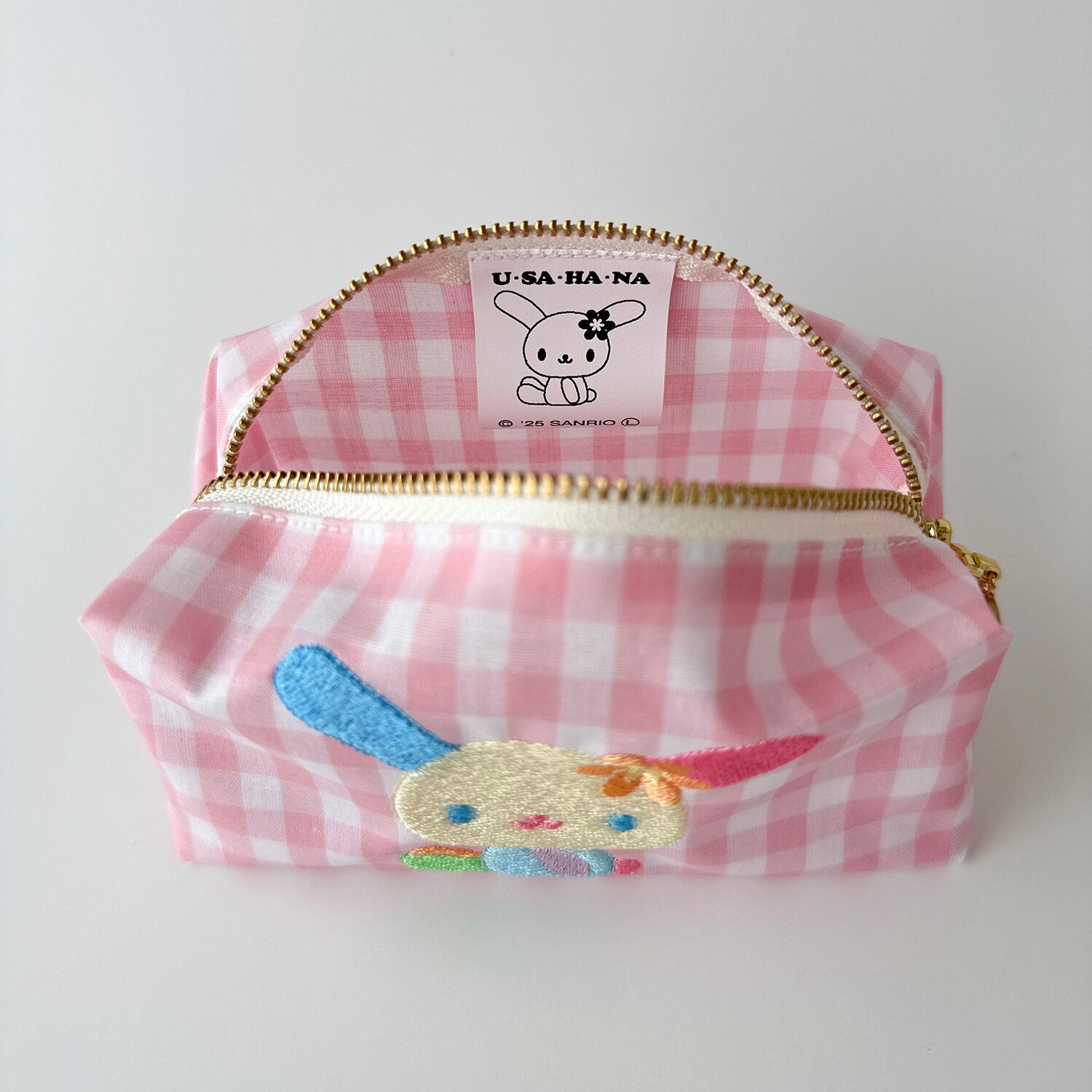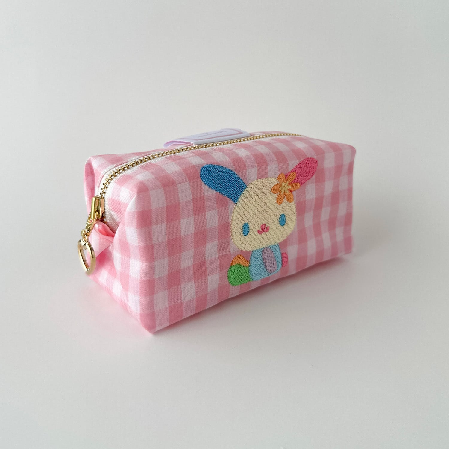 ギンガムチェックの生地にキャラクターを大きく刺しゅうしたとても可愛いデザインのポーチ。
