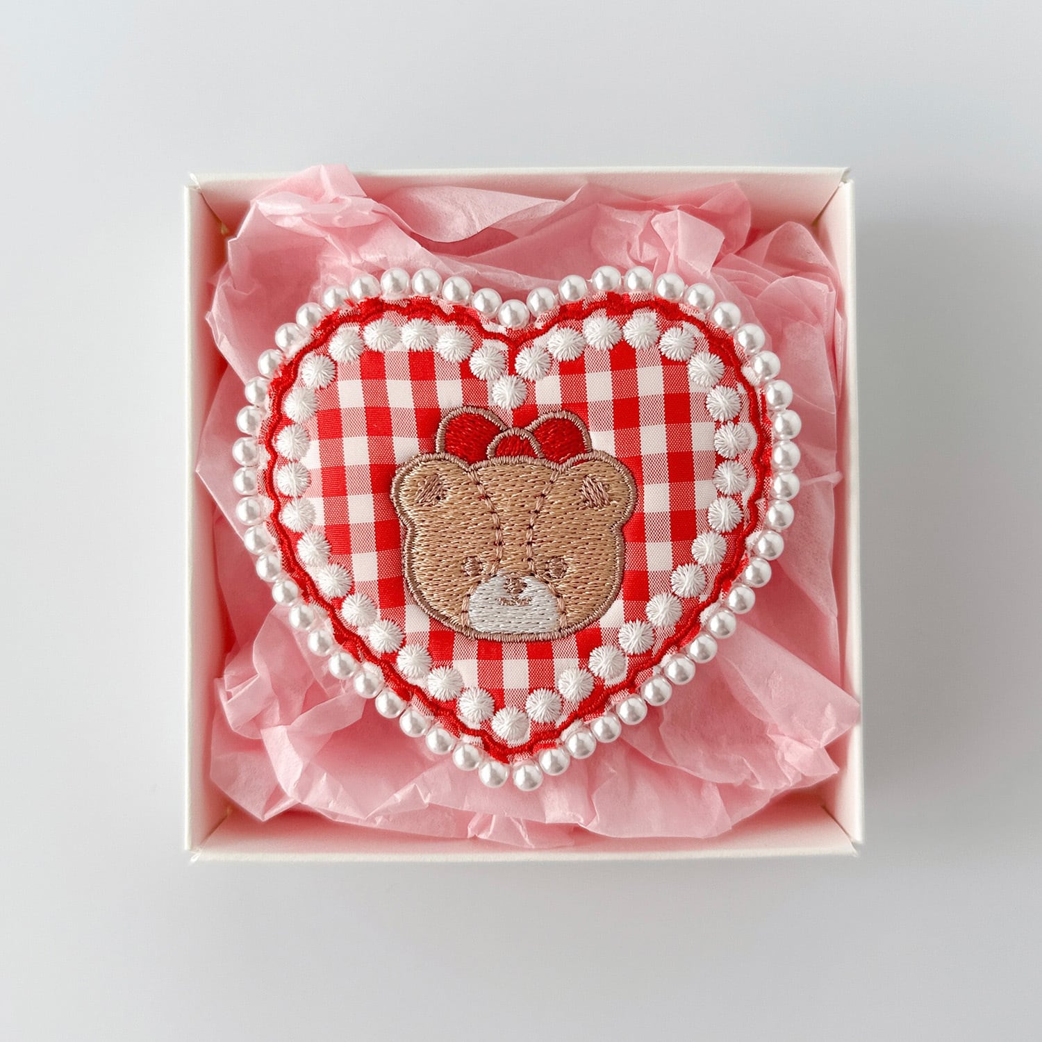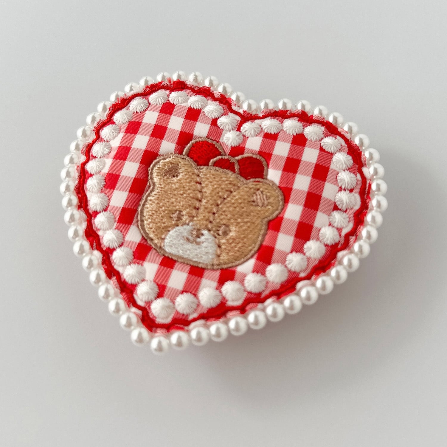 ハートモチーフにキャラクター刺繍を配したクリップタイプのアクセサリー
