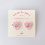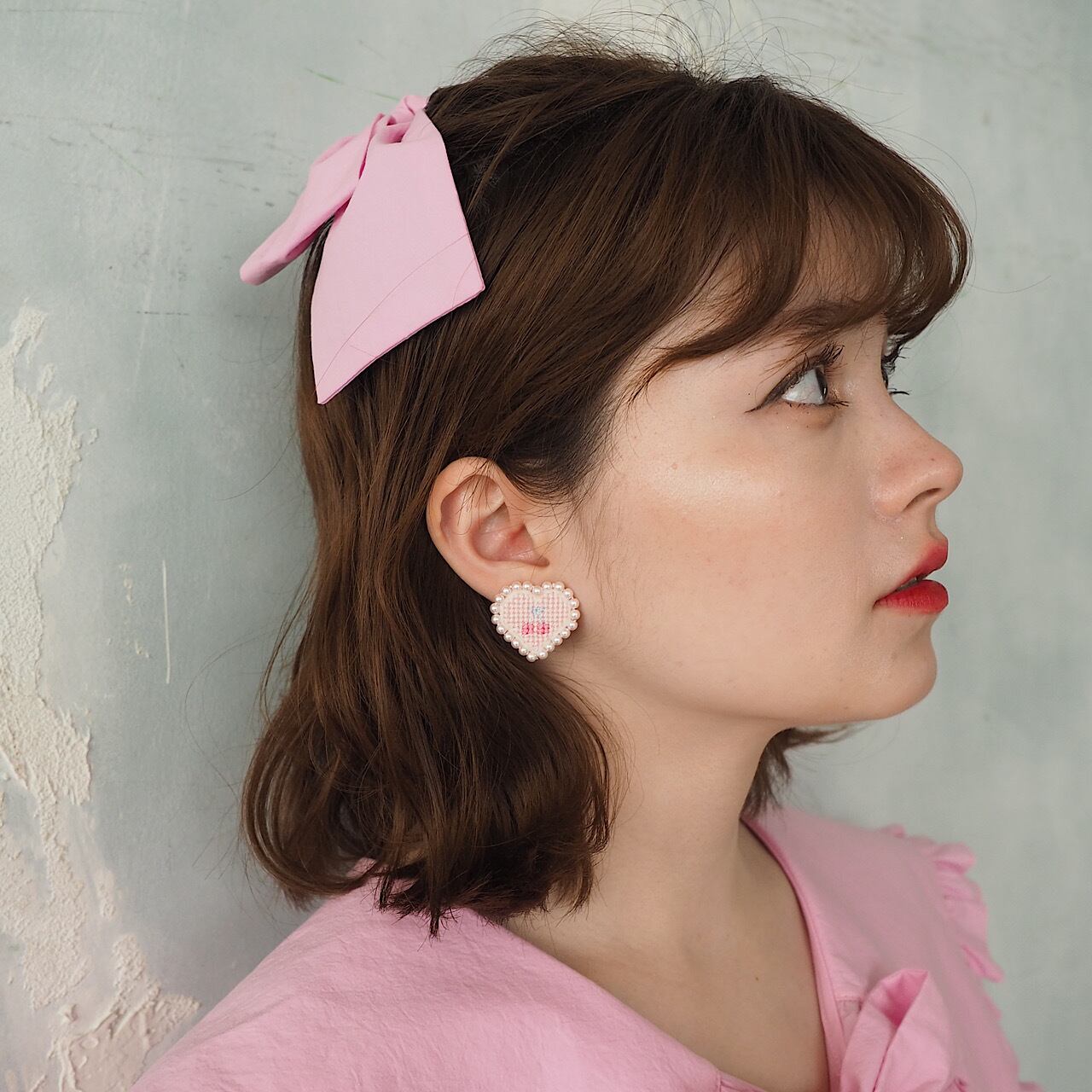 ハート型のチェリークロスステッチ刺しゅうのまわりにパールやビーズを配したガーリーなイヤーアクセサリーです。