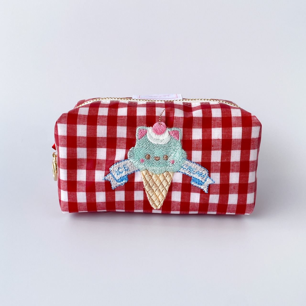 ギンガムチェックの生地にオリジナルのネコアイス刺しゅうをしたラブリーなポーチ