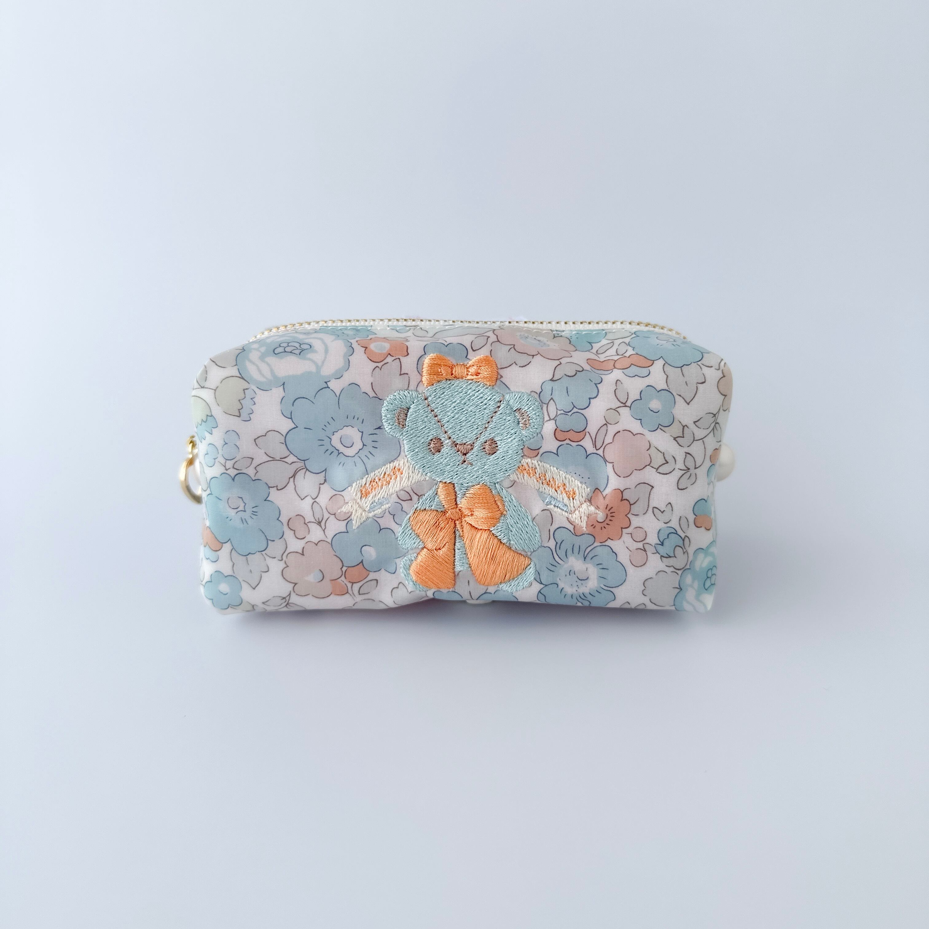 リバティ生地にリボンベアの刺しゅうをしたとても可愛いデザインです。クマ好きさんにお選び頂いています。